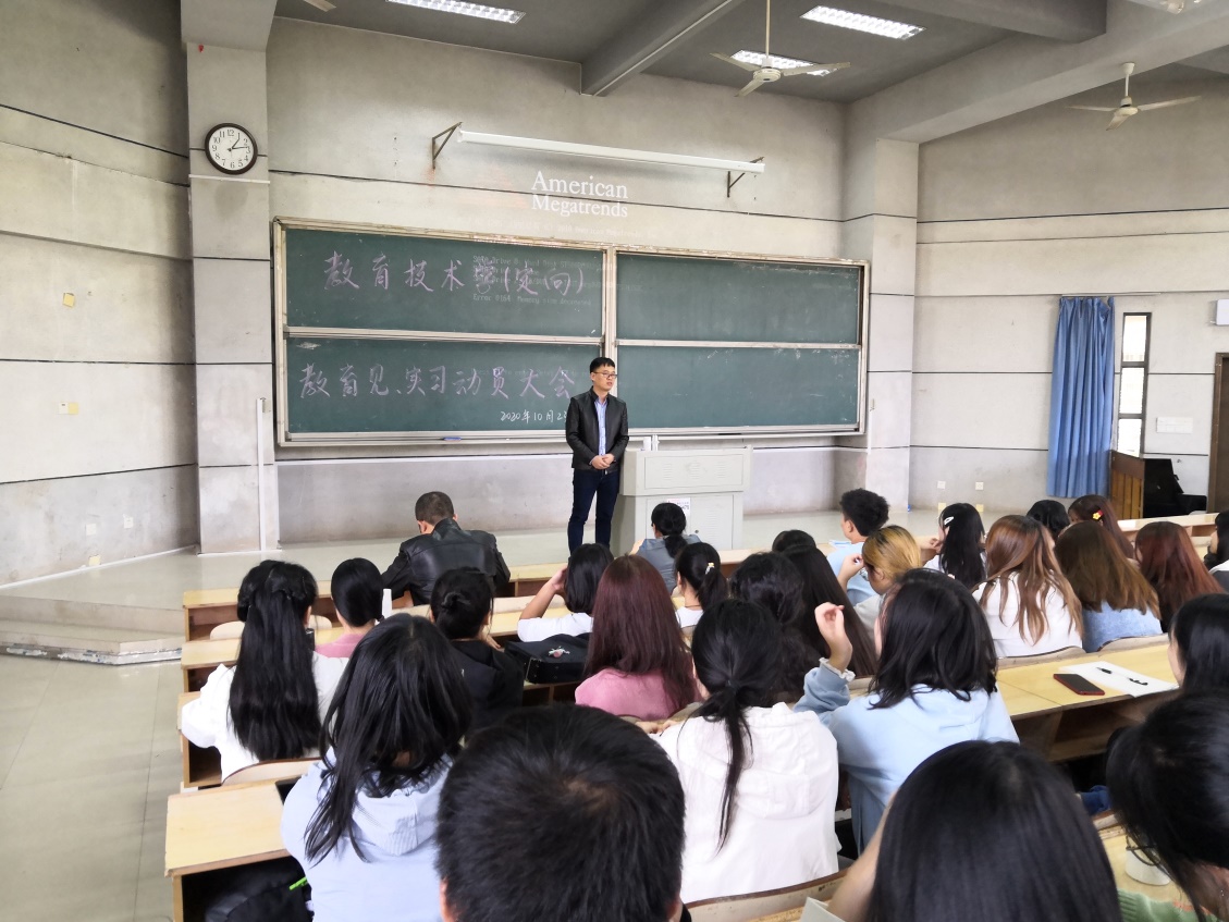 10月23日中午,开云官网组织2018、2019级六年制教育技术学专业全体学生,在润寰南105召开了2020年教育见习及教育实习动员大会。学院副院长何向阳、党总支副书记成夏炎及带队教师祁玉娟、刘琳出席,小学信息技术教育教研室主任黄悦主持大会。