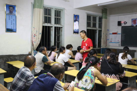 7月15日晚上19点,文明瑶族乡第一片小的一年级教室迎来了一群“特殊”的学生,这些学生有的三十出头,有的两鬓斑白,这些“学生”其实是新航向·梦之队暑期班学生的家长,而这些家长集合的原因是新航向·梦之队开展的成人课堂。