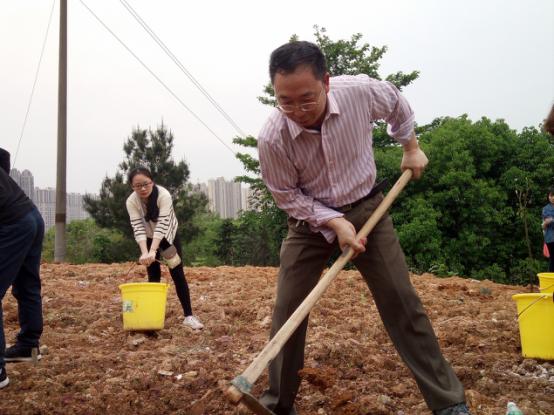 植树现场,学院党总支书记王杰文与老师同学们拿起铁锹、锄头热情地参与到植树活动中。同学们被领导老师的热情所感染,有的挥锹铲土,有的扶树填土,有的培土浇水,忙得不亦乐乎。王杰文书记一边用力地挥动着锄头一边向同学们传授着植树要领:“挖土下去那一下要使劲!土里面的石头要拣出来!”。经过将近一个小时的劳动,100多棵树在山坡上“安家落户”,为一师校园添上了一抹“信工绿”。虽然在植树过程中下起了雨,泥巴裹满了老师、同学们的裤腿,但是开云官网师生仍然坚持完成了植树任务。