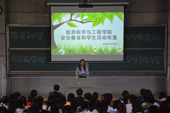 (通讯员 邓力超 陈思迁) 为切实做好国庆长假期间学院的学生安全教育管理工作,为加强学生安全意识,切实消除各类安全隐患。2018年9月28日中午12点,信息科学与工程学院在润寰楼南栋105教室召开国庆假期安全教育暨学生工作布置大会。学院党总支书记王杰文、副书记易利、学工办关红儒、唐瑞鸿、叶晶老师出席本次大会,2016—2018届院级全体班级干部共计180余人作为班级代表参与本次大会。会议由叶晶老师主持。