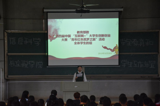 紧接着,学院2018年暑期三下乡新航向梦之队队长王伦分享了一段详尽温情的支教扶贫视频,就暑期开云kaiyun官方网站赴汝城县教育帮扶关爱团的活动情况进行了汇报,并恳切希望各班班干部能够群策群力,积极号召班级同学,支持三下乡活动。学生代表欧阳欣满怀激情地朗读了《教育部致第四届中国“互联网+”大学生创新创业大赛“青年红色筑梦之旅”活动全体学生的信》,教育部在回信中转达习近平总书记的亲切问候,勉励大学生将自身青春梦融入国家中国梦中,共同实现中华民族伟大复兴,传递了当代青年“敢闯会创”的蓬勃朝气。