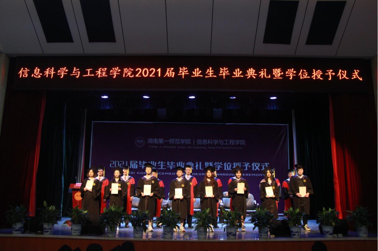 8时57分,现场人员全体起立,在热烈的掌声和激昂的校歌声中,学院领导及教授代表进入会场并入座。9时许,全体人员庄严肃立,高唱国歌,信息科学与工程学院2021届毕业生毕业典礼暨学位授予仪式正式拉开序幕。