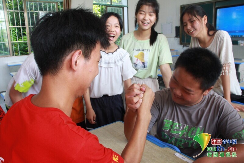 图为竹笋班班主任在开班仪式上与学生做游戏比赛掰手腕,双方都用了“全力”。中国青年网通讯员 欧阳健 摄