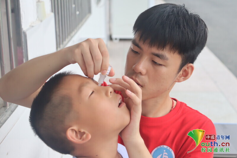 图为志愿者小心翼翼地帮眼睛不舒服的小孩子滴眼药水。中国青年网通讯员 段新利 摄