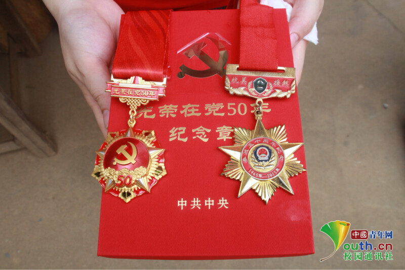 图为革命老军人廖中华光荣在党五十周年、参战五十周年的纪念章。中国青年网通讯员 欧阳健 摄