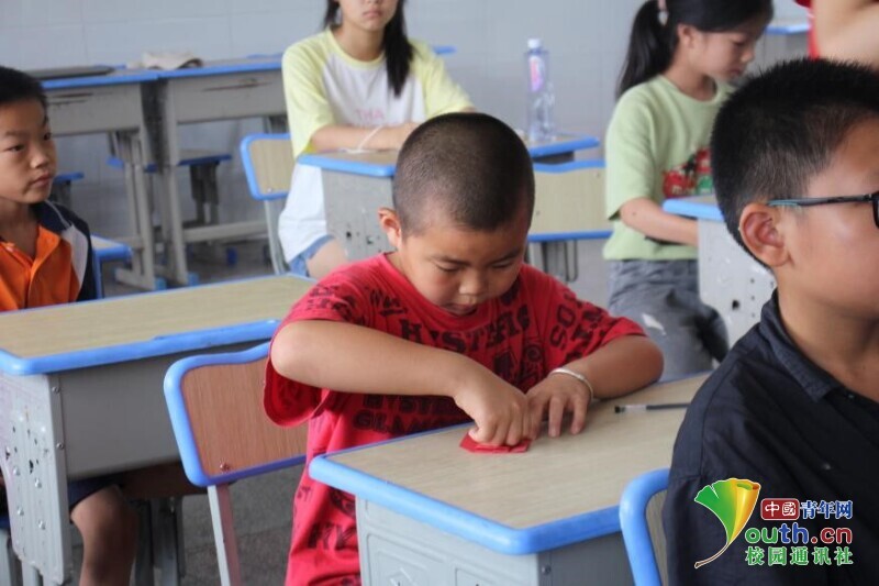 图为孩子们听完志愿者讲解示范之后,亲身实践,进行折纸活动。中国青年网通讯员 段新利 摄