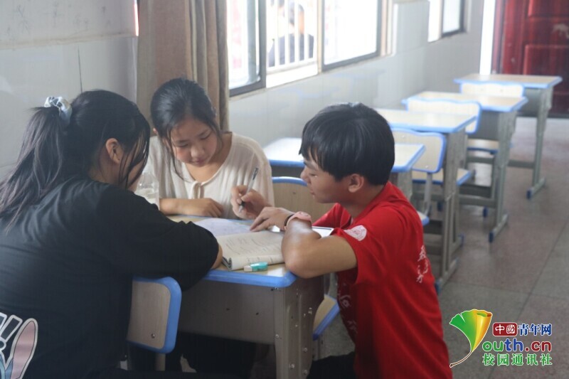 图为课间志愿者耐心辅导孩子们暑假作业的场景。中国青年网通讯员 段新利 摄