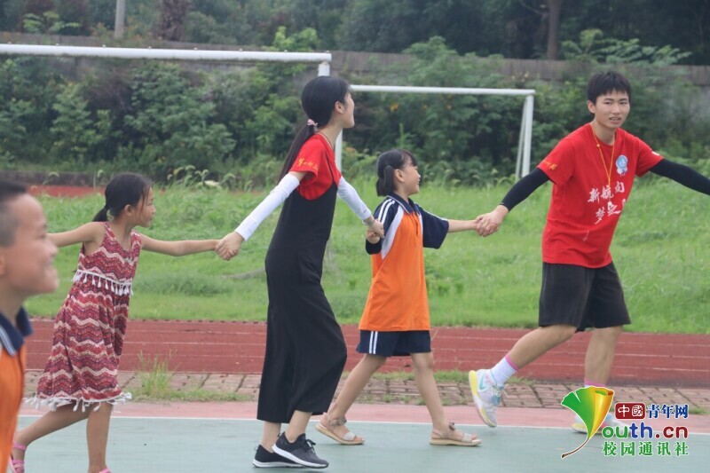 图为体育课上志愿者与孩子们正在开心的开展游戏。中国青年网通讯员 段新利 摄