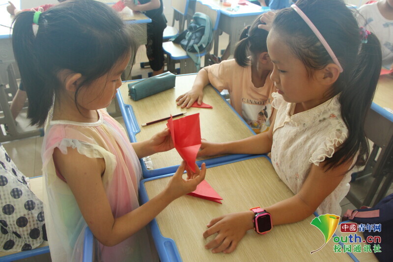 图为在手工课上,一名已完成所需步骤的学生向另外一名学生示范。中国青年网通讯员 邹诗琪 摄
