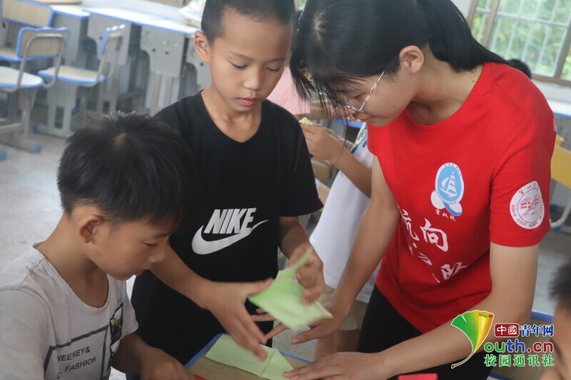 图为手工课上志愿者弯下腰耐心的教孩子们折难度比较大的恐龙。中国青年网通讯员 段新利 摄