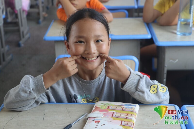 图为课间志愿者与孩子们交流感情时孩子做出开心的表情。中国青年网通讯员 段新利 供图