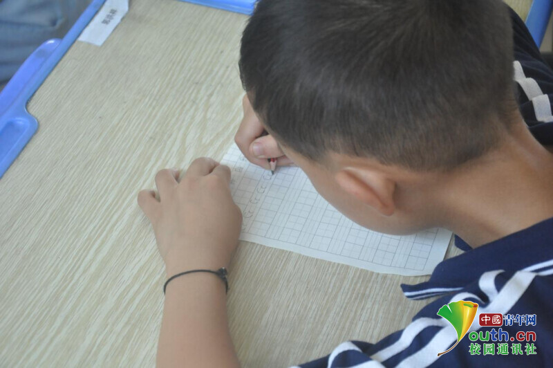 图为趣味英语课上,学生在老师的示范下,正在练习写英语字母。中国青年网通讯员 何星逸 摄