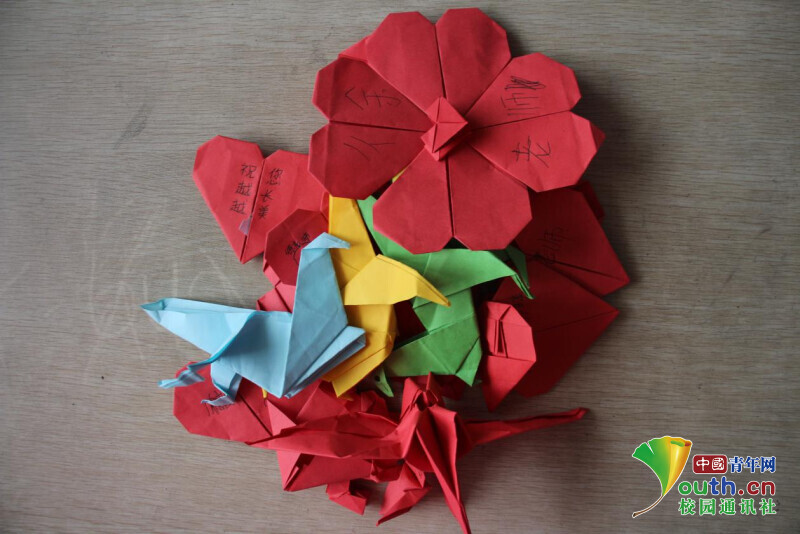 图为趣味手工课上,学生们在志愿者的带领下学会了折红心,学生们正开心的展示着自己的作品。中国青年网通讯员 欧阳健 摄