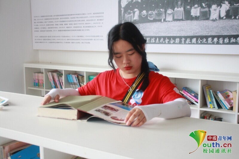 图为志愿者正在仔细阅读张国基撰写的教育著作。中国青年网通讯员 段新利 摄