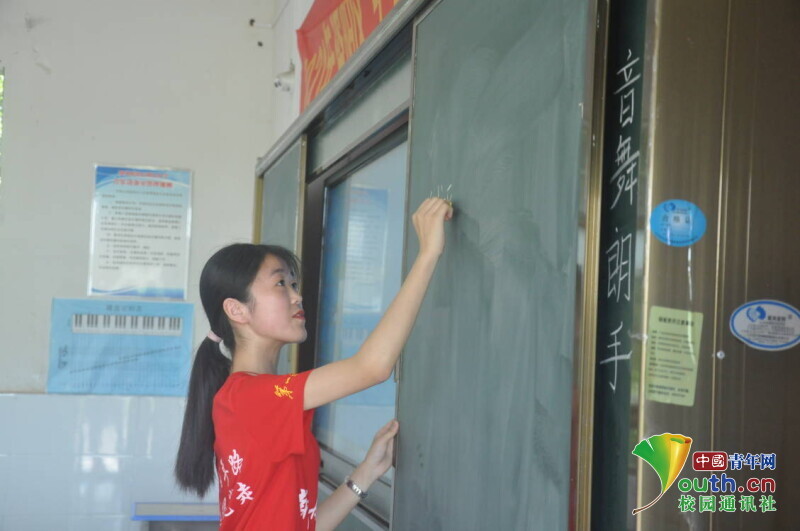 图为志愿者老师在主持朗诵课上认真书写课文题目板书《南方的夜》。中国青年网通讯员 欧阳健 摄