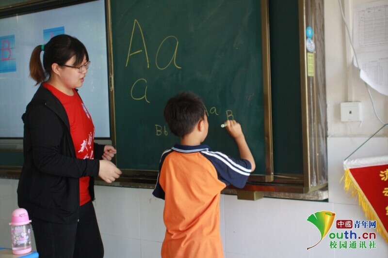 图为在趣味英语课上志愿者老师让主动举手的学生上台背写英文字母,老师也在一旁耐心提示。中国青年网通讯员 王彬艳 摄