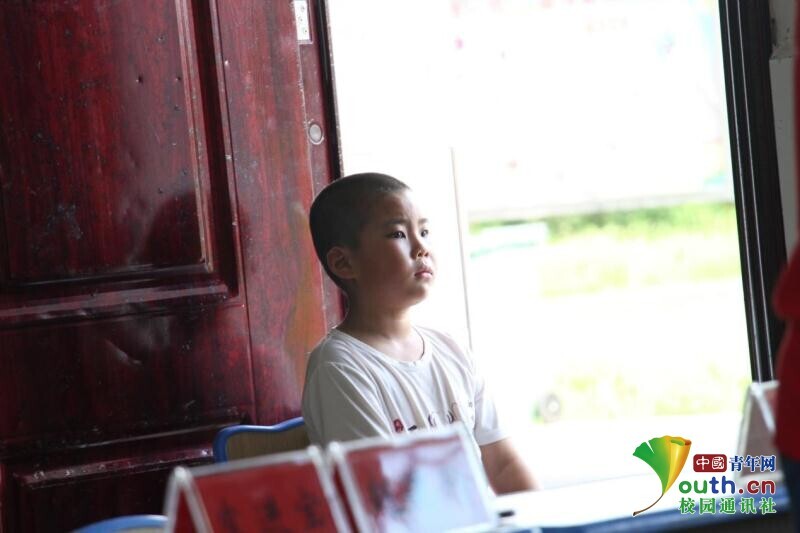 图为第一个抵达学校的孩子,坐在教室门口对即将到来的夏令营生活充满期待,静静等待着同学们的到来。中国青年网通讯员 段新利 摄