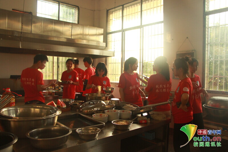 图为 新航向·梦之队队员们在食堂准备吃晚餐。中国青年网通讯员 何星逸 摄