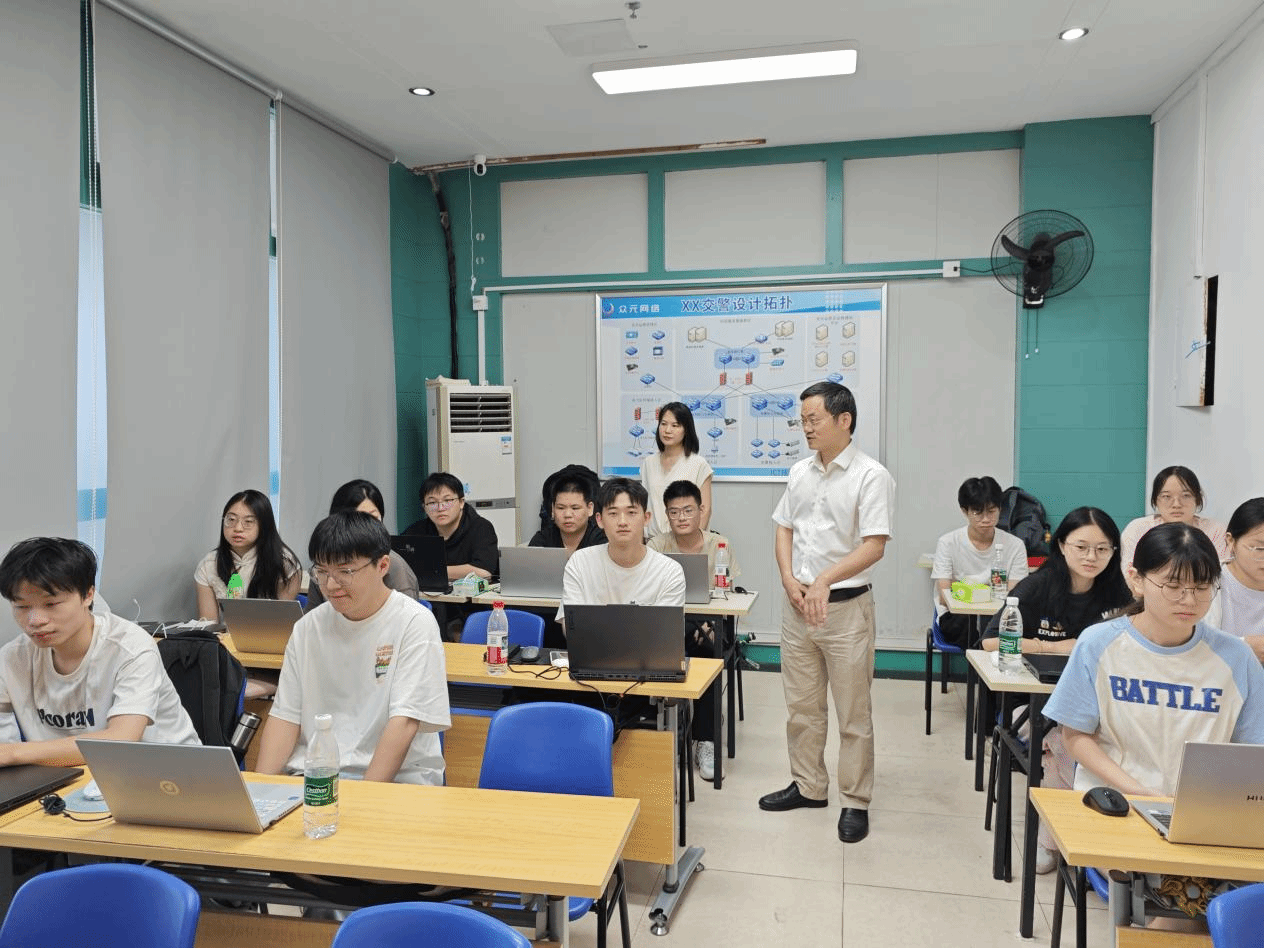 走访中,学院领导与学生面对面交流,详细了解他们在网络技术实践中的具体操作情况。学生们分享了配置VLAN隔离不同业务网段、通过链路聚合提升网络带宽利用率等实操案例杨恒伏鼓励学生们珍惜企业实践机会,重点提升网络架构设计与故障处理等核心技能,为未来从事网络工程师、系统集成等岗位积累经验。