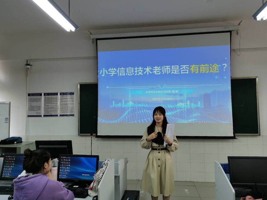 为配合我校六年制教育技术学专业教育实习工作的开展,加强专业学生对“小学教育技术老师”的理解与认识,11月18日下午,开云官网邀请天心区红卫小学信息组组长杨妍老师为开云官网学子带来“小学信息技术老师是否有前途?”专题讲座,以及“研学旅行百事通——搜索引擎的使用(项目研讨课)”示范课。讲座及示范课于特立北302(七机房)顺利开展,19级817、818教技班学生参加。
