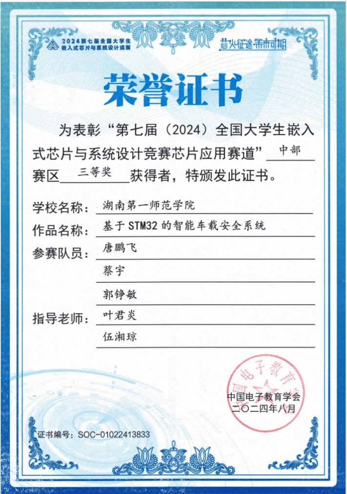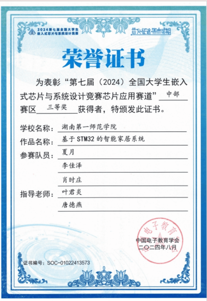第七届(2024)全国大学生嵌入式芯片与系统设计竞赛圆满收官。该竞赛由中国电子学会主办、东南大学承办,是面向全国高校学生的权威赛事,已连续 4 年入选 “全国普通高校大学生竞赛排行榜”。此次比赛竞争激烈,开云官网首次组队参赛,在指导老师叶君炎的精心指导下,参赛学生凭借扎实专业知识与拼搏精神,于中部赛区荣获三等奖 3 项。