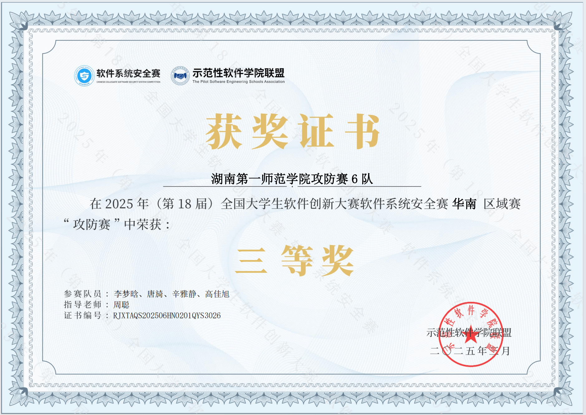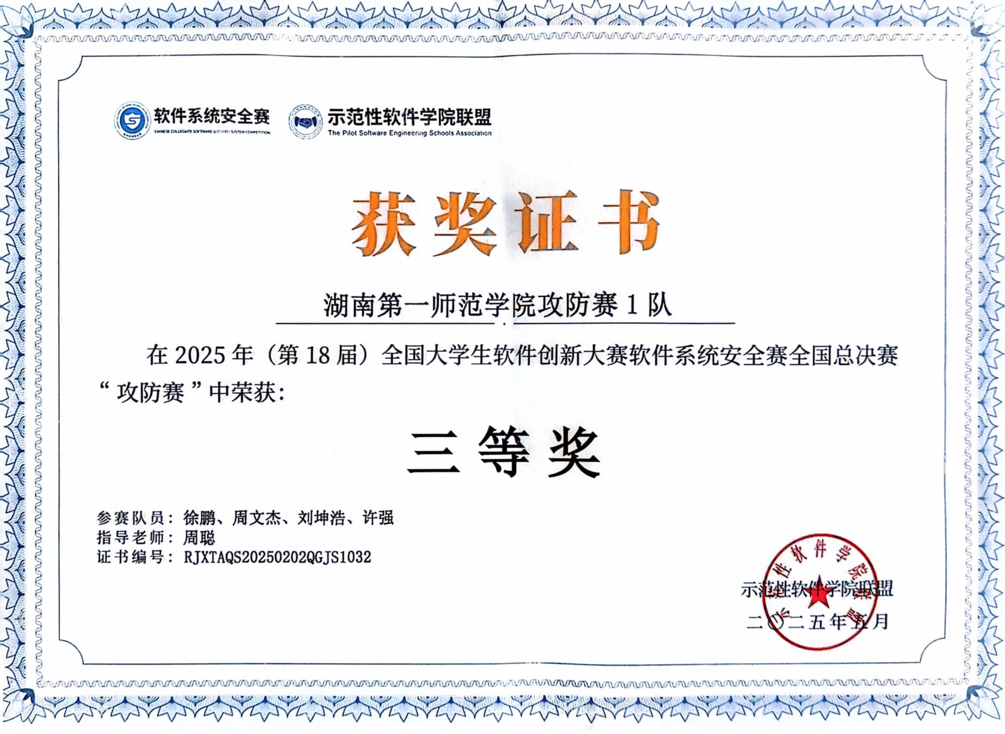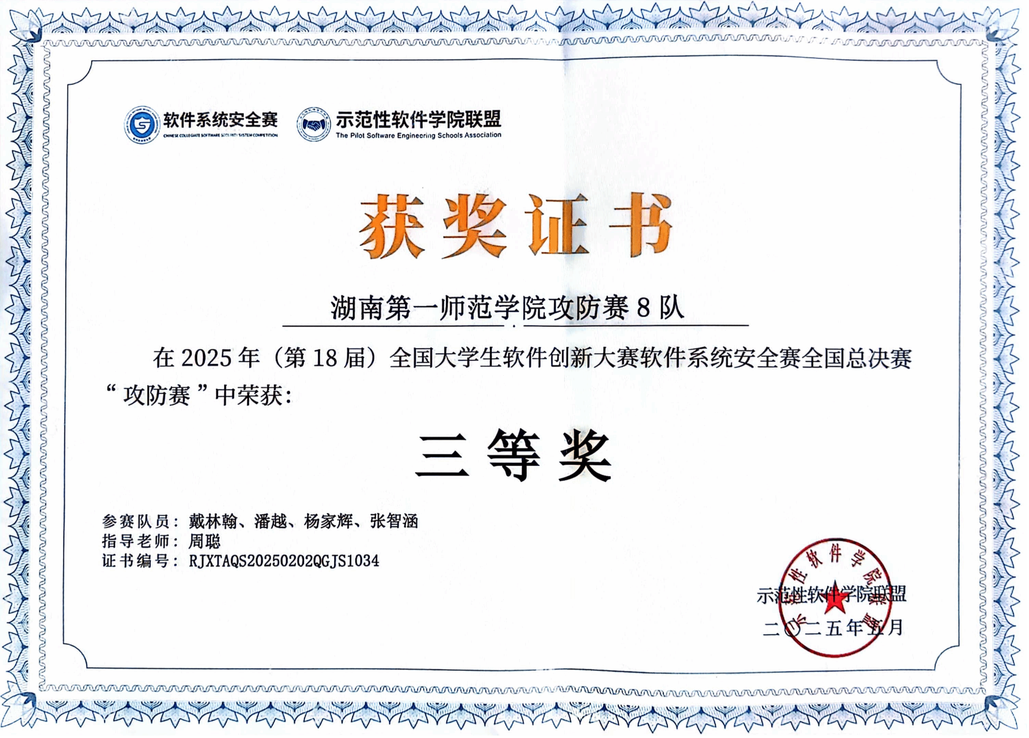 第18届全国大学生软件创新大赛软件系统安全赛全国总决赛于2025年5月18日在湖南大学圆满落幕。湖南高校共有18支团队获奖。其中我院的2支参赛团队荣获攻防赛三等奖,实现了网安竞赛团队在国家级赛事中获奖的突破。在区域赛阶段,开云官网参赛团队表现出色,斩获一等奖2项、二等奖1项、三等奖3项,位居华南赛区前列。