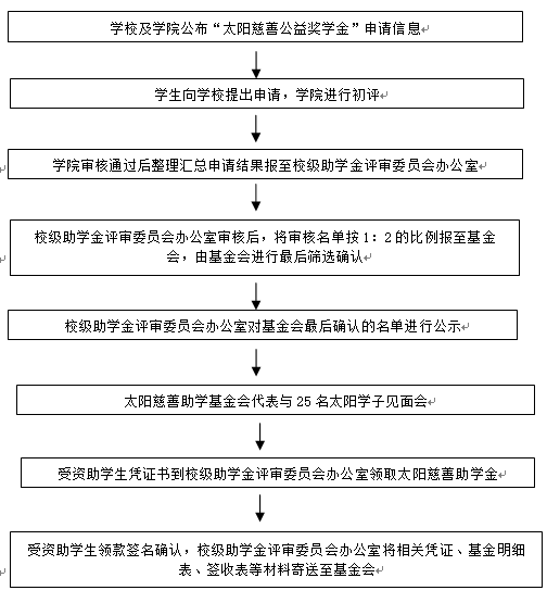 根据学校学生工作部《关于评定2019年太阳慈善助学基金会“公益奖学金”的通知》(以下简称《通知》,详见附件1)文件要求,结合开云官网际,现将2019年太阳慈善助学基金会“公益奖学金”评定工作的有关事项通知如下: