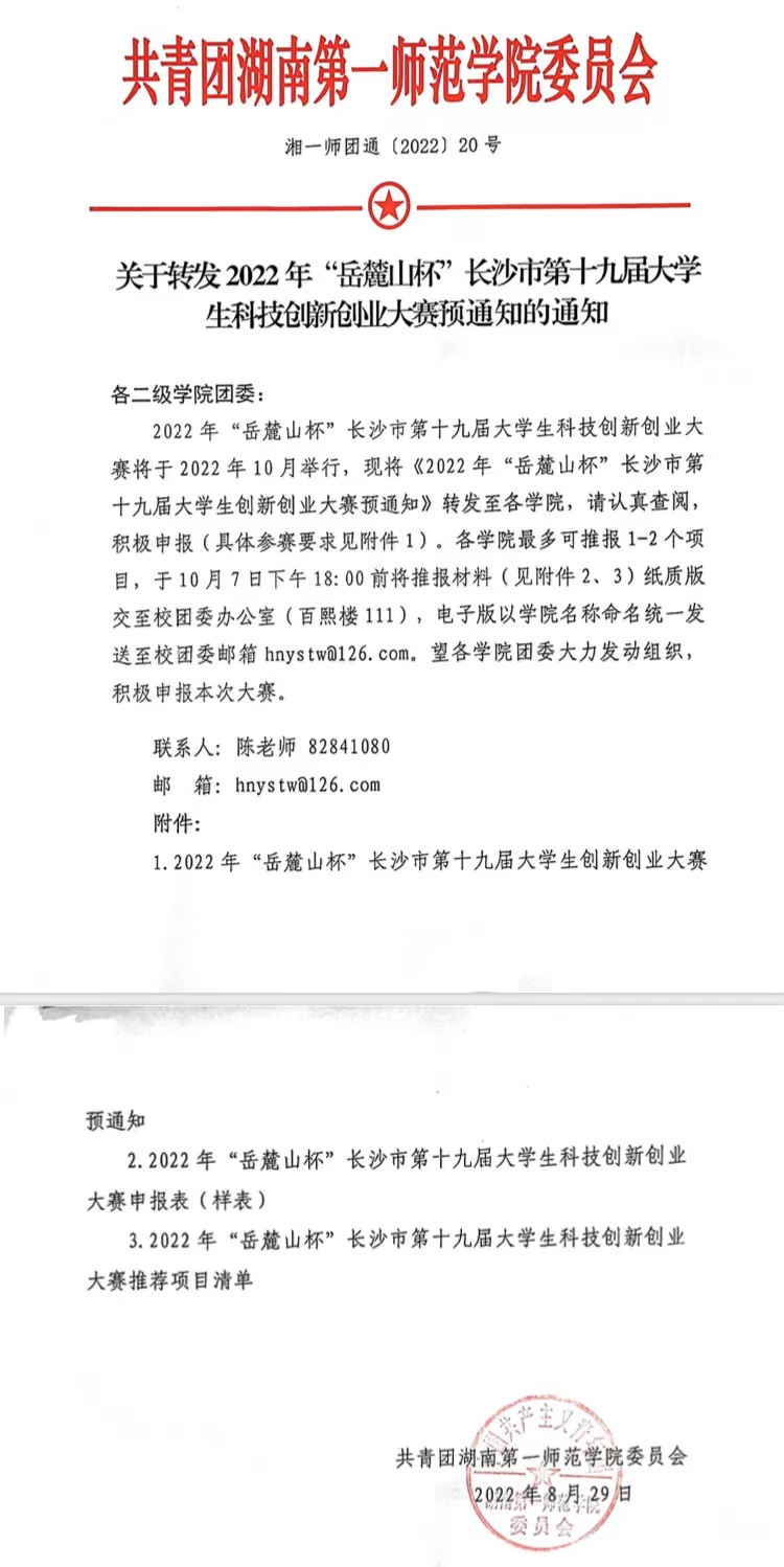 现将校团委《关于转发2022年“岳麓山杯”长沙市第十九届大学生科技创新创业大赛预通知的通知》转发,请按照文件要求,广泛宣传,积极动员学生参加大赛,具体参赛要求见附件1。请各团支书于10月4日下午18:00前将推报材料(见附件2、3)纸质版、电子版以班级名称命名上交院团委办公室刘博毓(QQ:2103156855,寝室号:12-537)。团委办公室于次日交至学院学工办(百熙楼127-5)。